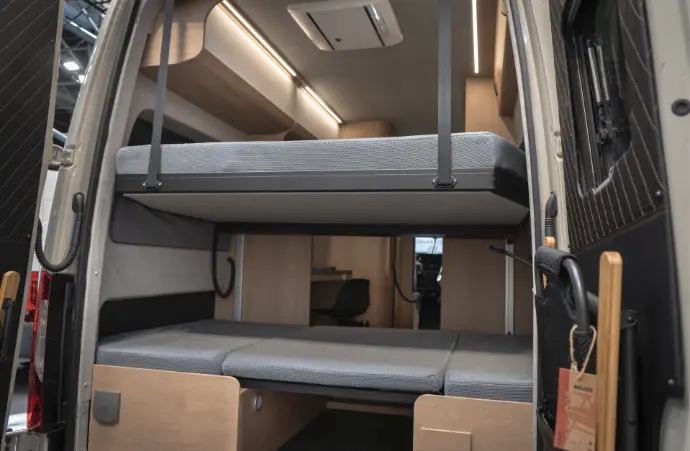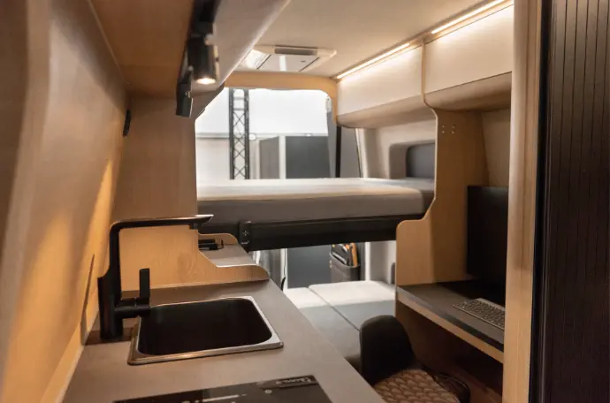Salón delantero amplio, cocina completa y baño funcional: distribución optimizada para vivir a bordo. Cama eléctrica principal (197×140 cm) y cama inferior modular (190×140 cm). Extensiones laterales integradas de serie para dormir en transversal y aprovechar al máximo el espacio interior. Opcionalmente, techo elevable con cama doble superior.