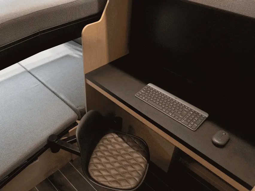 La Atacama redefine el concepto de teletrabajo. Hemos integrado un innovador espacio de estudio de más de un metro de largo, diseñado para que tu productividad no tenga límites. Este amplio y funcional escritorio, junto a un práctico armario inferior, te ofrece la comodidad y el orden que necesitas para trabajar, crear o planificar tu ruta. Ahora puedes responder a ese email importante con vistas a un paisaje de ensueño. Tu oficina viaja contigo.