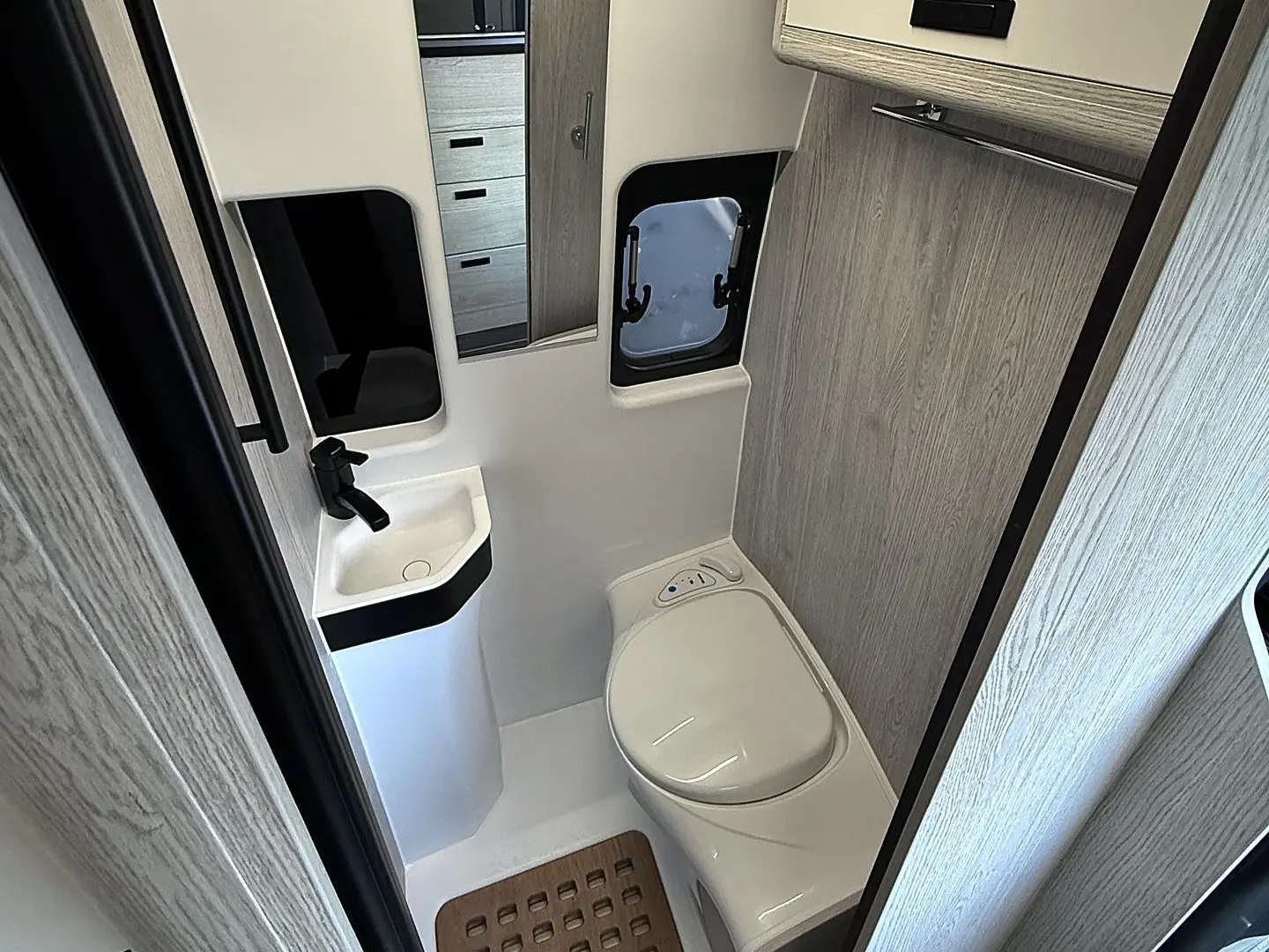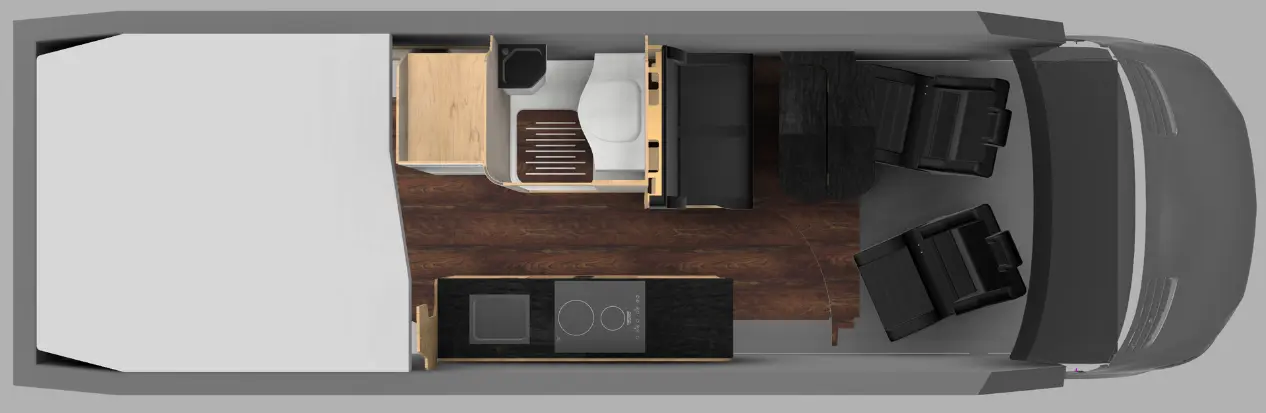 Salón delantero amplio, cocina completa y baño funcional: distribución optimizada para vivir a bordo. Cama eléctrica principal (197×140 cm) y cama inferior modular (190×140 cm). Extensiones laterales integradas de serie para dormir en transversal y aprovechar al máximo el espacio interior. Opcionalmente, techo elevable con cama doble superior.