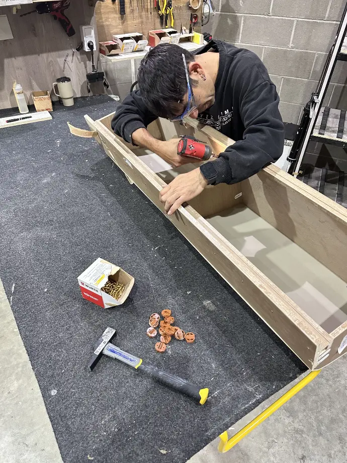 Detallista y ordenado, Jaume transforma las piezas de madera en mobiliarios funcionales y perfectamente ensamblados. Su precisión y visión estructural son fundamentales en la calidad final de cada camper.